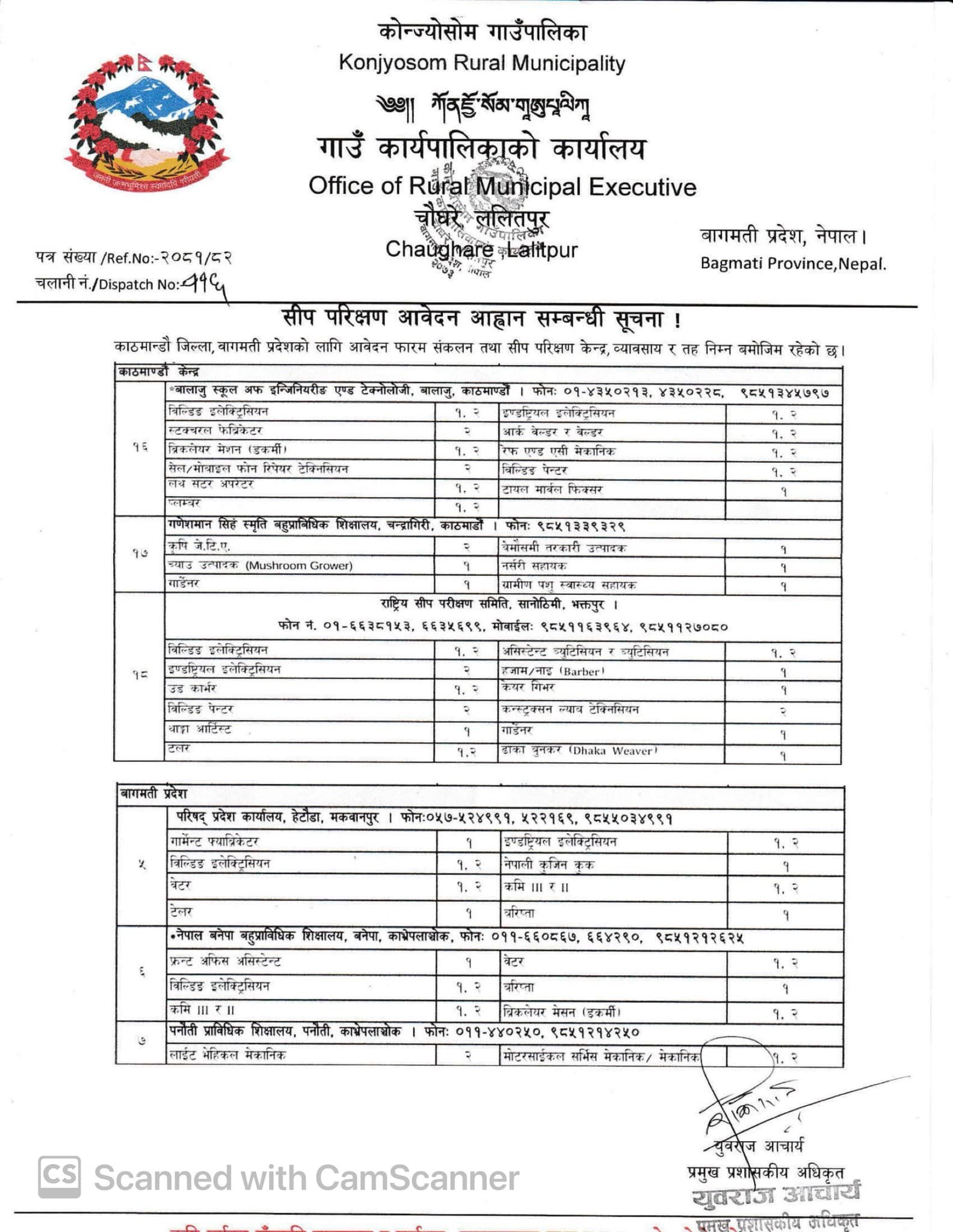 प्राविधिक शिक्षा तथा व्यावसायिक तालिम परिषद् राष्ट्रिय सीप परीक्षण समिति स्वीकृत राष्ट्रिय व्यावसायगत सीप प्रमाणिक अनुसार नियमिततर्फ सहुलियत शुल्कमा सञ्चालन हुन पूर्व सिकाइका मान्यतामा आधारित सीप परीक्षणमा सहभागि हुन चहाने स्वरोजगार व्यावसायिक अनुभव भएका वा वैदेशिक रोजगारीबाट फर्केका अनुभवी नेपाली नागरिकहरुबाट आफूलाई पायक पर्ने परीक्षण केन्द्रमा उपस्थित भइ आवेदन पेश गर्न गाउँपालिकाले आग्रह गरेको छ ।