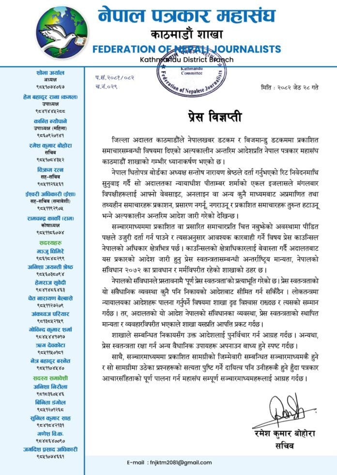 काठमाडौं ।  नेपाल पत्रकार महासंघ काठमाडौं शाखाले सञ्चारमाध्यममाथि जिल्ला अदालत काठमाडौंले दिएको अल्पकालीन अन्तरिम आदेशप्रति गम्भीर आपत्ति जनाएको छ । शाखाका सचिव रमेश कुमार बोहोराले प्रेस विज्ञप्ति जारी गर्दै प्रेस स्वतन्त्रताको विरुद्धमा आएको यो आदेशको पुनर्विचार गर्न सम्बन्धित निकायसँग आग्रह गरेका छन् ।