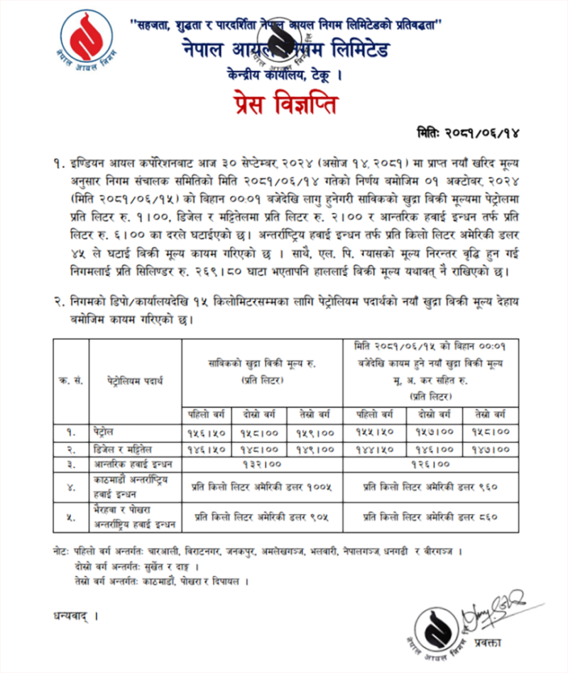 नयाँ मूल्यसूची आज रातिदेखि लागू हुनेछ।