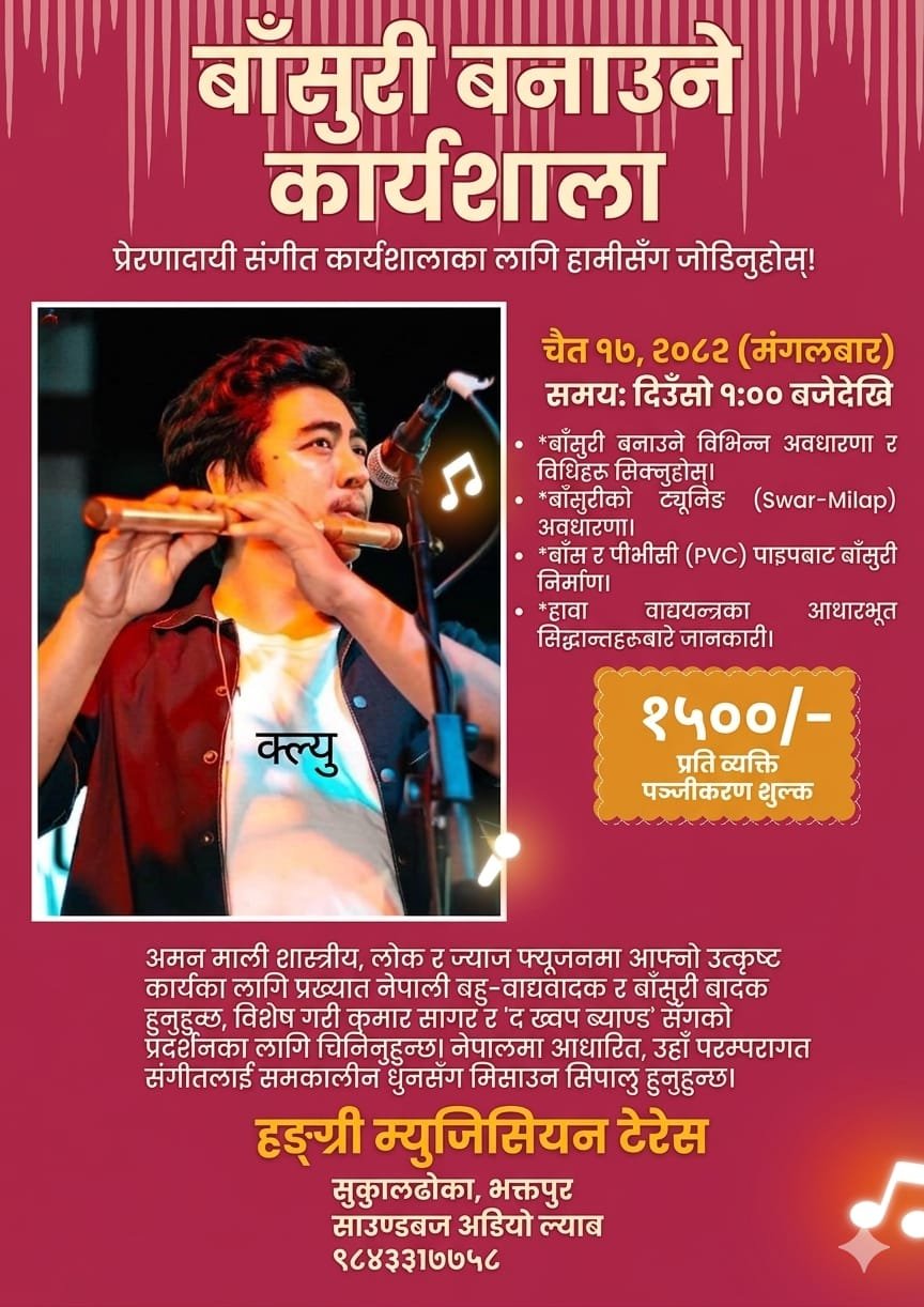 भक्तपुरको सुकुलढोकास्थित साउन्डबज अडियो ल्याबमा दिउँसो १:०० बजेदेखि सुरु हुने यस कार्यशालामा सहभागीहरूलाई बाँसुरी बनाउने विभिन्न विधि र सैद्धान्तिक ज्ञान प्रदान गरिनेछ।