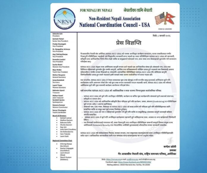 एनआरएन अमेरिकाले जारी गरेको प्रेस विज्ञप्ति मै संघ संयुक्त राज्य अमेरिकामा कानुनी रूपमा दर्ता भएको एक आधिकारिक संस्था भएको उल्लेख गर्दै, संस्थाको नाम र पहिचान प्रयोग गरी गरिने कुनै पनि अनधिकृत गतिविधिले गम्भीर कानुनी, आर्थिक तथा प्रतिष्ठागत जोखिम सिर्जना गर्ने बताइएको छ।