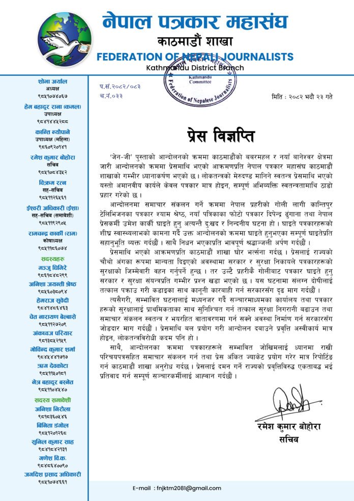 काठमाडौं शाखाका सचिव रमेश कुमार बोहोराले जारी गरेको विज्ञप्तिमा आन्दोलनमा समाचार संकलन गर्ने क्रममा प्रहरीको गोली लागी कान्तिपुर टेलिभिजनका पत्रकार श्याम श्रेष्ठ, नयाँ पत्रिकाका फोटो पत्रकार दिपेन्द्र ढुंगाना तथा नेपाल प्रेसकर्मी उमेश कार्की घाइते भएको दुःखद र निन्दनीय घटना भएको उल्लेख गरेका छन् ।