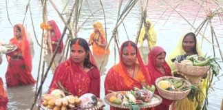 छठ पर्व : अस्ताउँदो सूर्यलाई विधिपूर्वक अर्घ दिइँदै