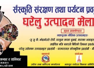 भक्तपुर । भक्तपुरको नःपुखु परिसरमा शुक्रवारदेखी दुई दिने घरेलु उत्पादन मेला २०८० शुरु भएको छ । घरेलु उत्पादनको प्रर्वद्धन, संस्कृति संरक्षण तथा पर्यटन प्रवद्र्धनका...